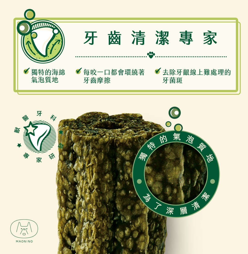 ❷ 清潔牙齒:伍夫潔牙棒海綿氣泡質地設計,為了讓狗狗可以確實咀嚼、更深入牙齦線上難清的邊邊角角,進而達到潔牙棒該有的效果!