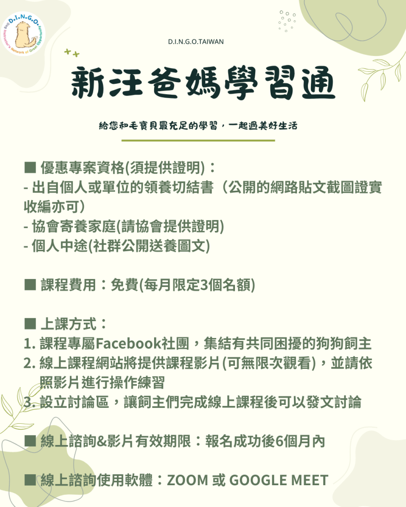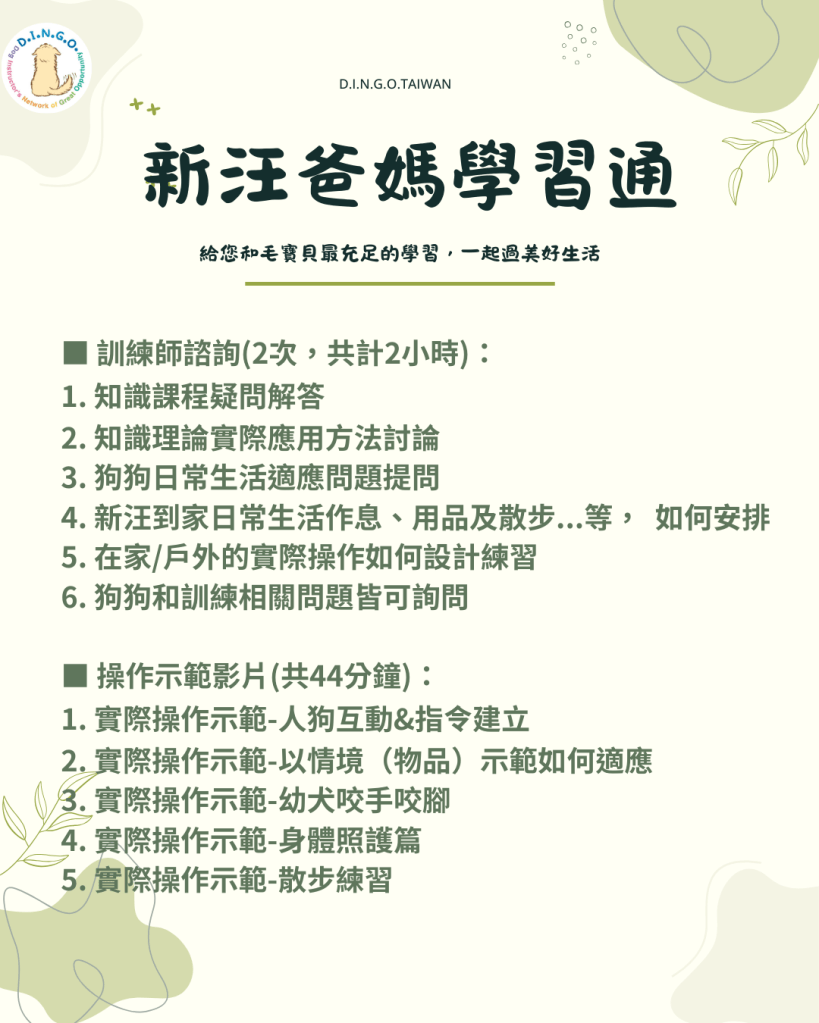 6. D.I.N.G.O. TAIWAN 認證訓練師線上諮詢2次(每次一小時,恕無法指定訓練師)