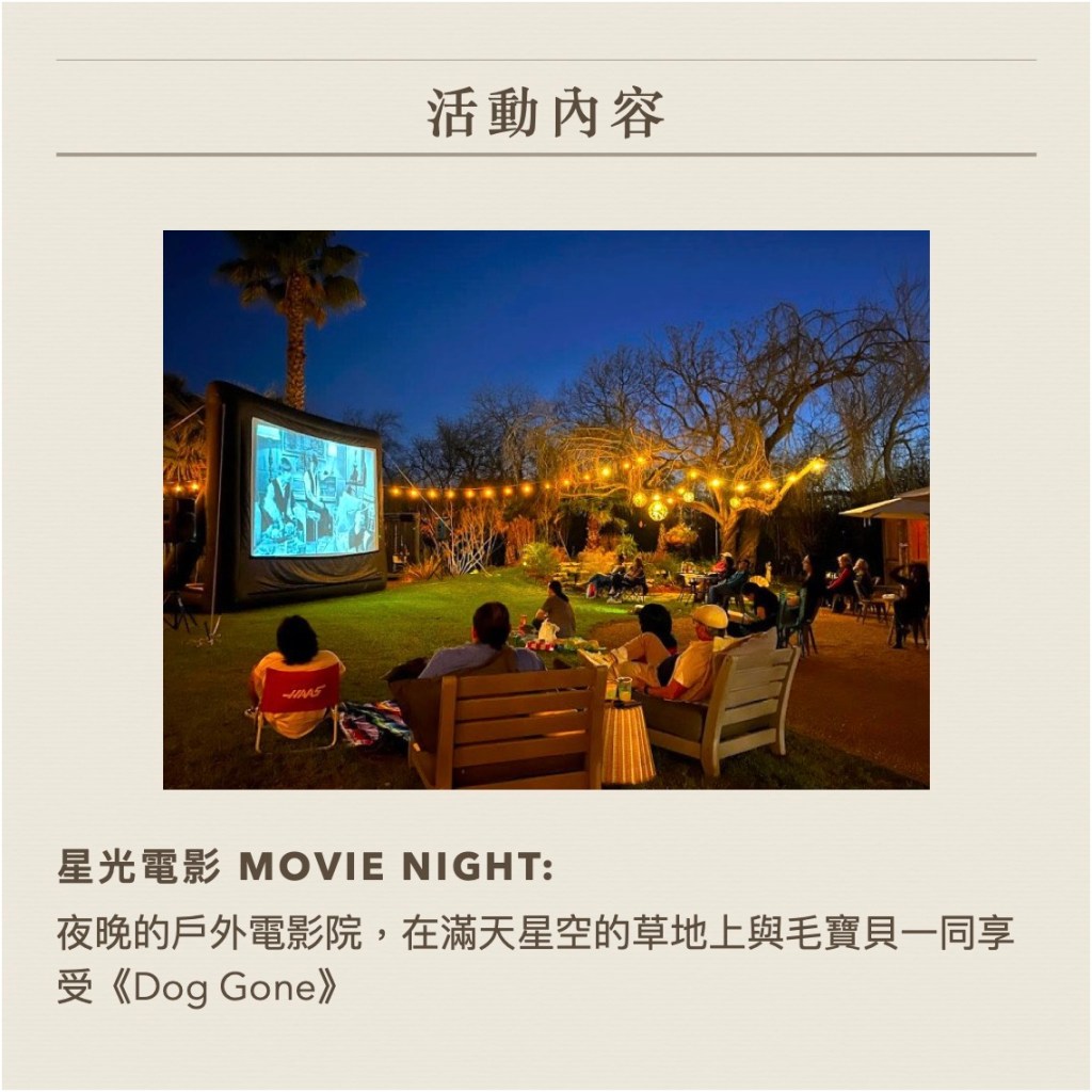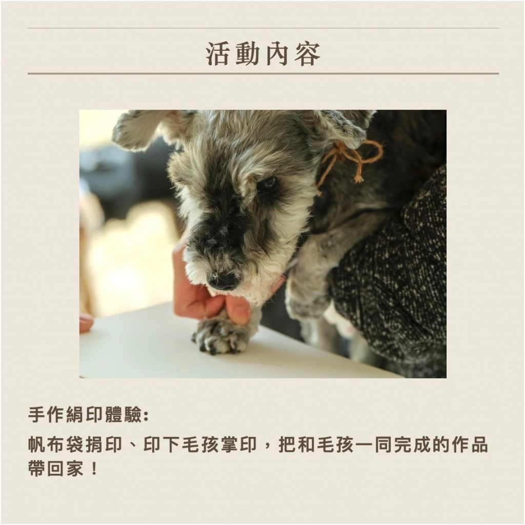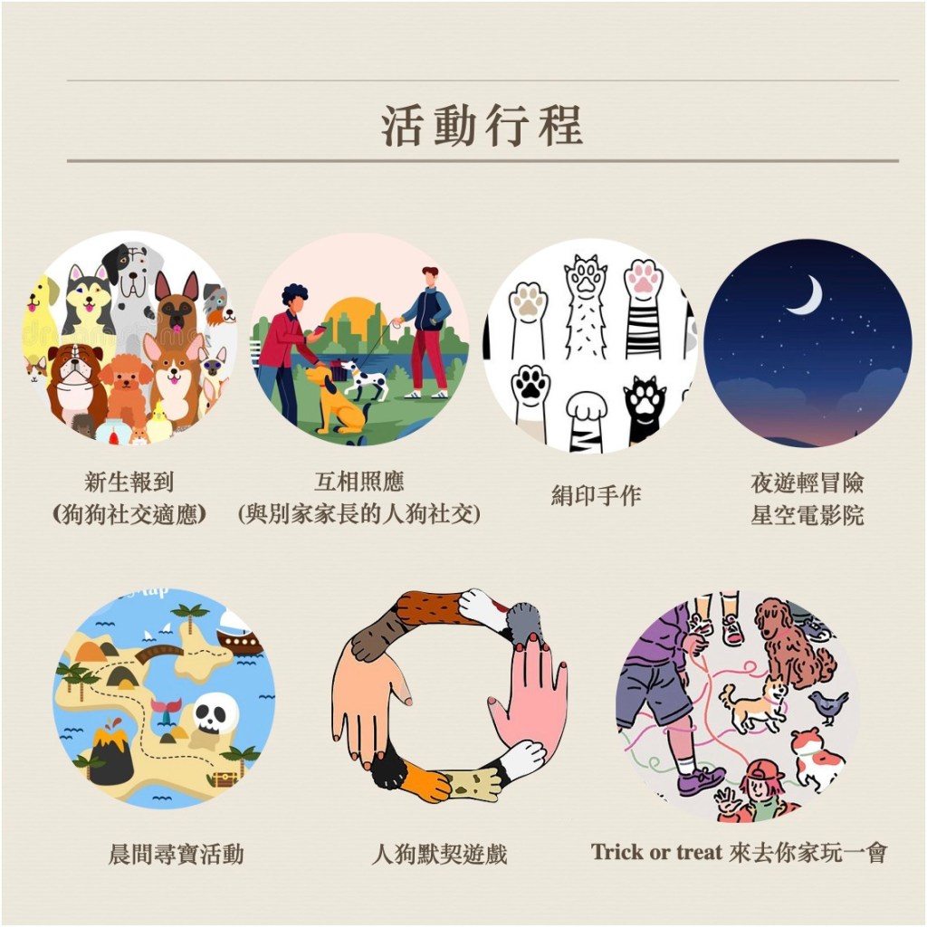 我們安排了人與狗都可以一同參加的活動,你可以選擇遠遠地參與也沒關係,就想像老師把教室帶到大自然,有更大的空間、更放鬆的氛圍,跟狗狗一起提昇社會化也好、一起投入全力去挑戰也好、只是靜靜享受彼此陪伴也好…由你和狗狗來決定!