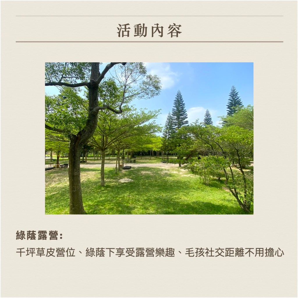 我們包下了幾乎整個營區,以求讓狗狗們擁有輕鬆的社交距離,大家都可以安心感受大自然帶來的愉悅與療癒。