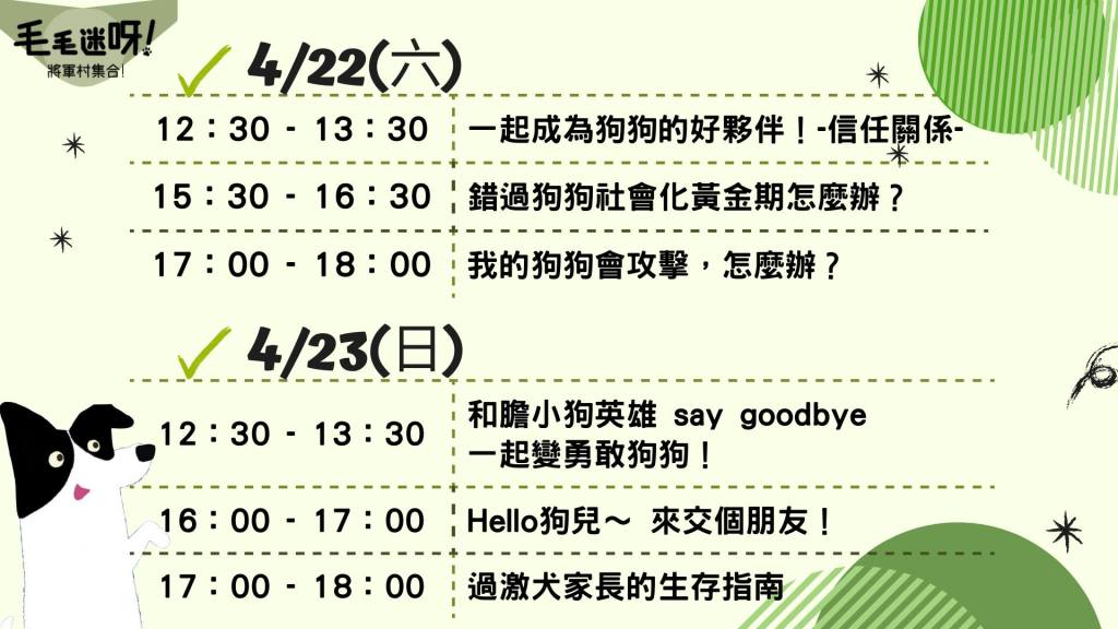 歡迎大家4/22、23一起帶毛孩吸收知識及放電~~~