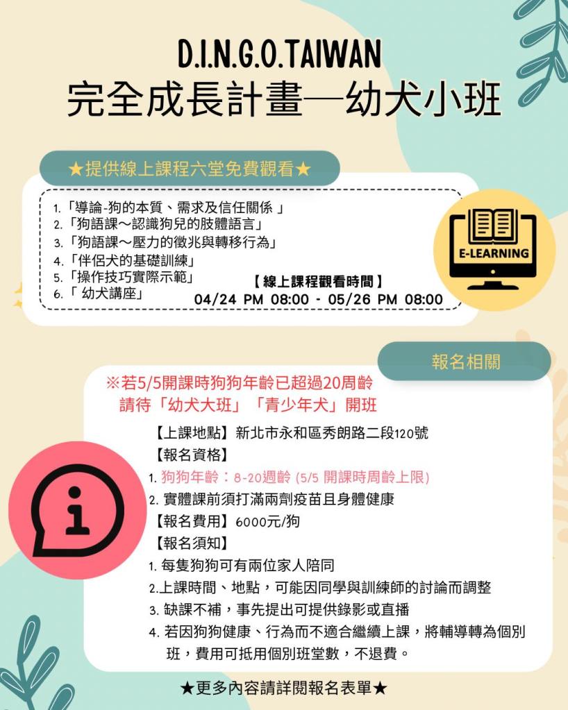 2.若開課時已超過20週齡,請待幼犬大班、青少年犬班開課時報名