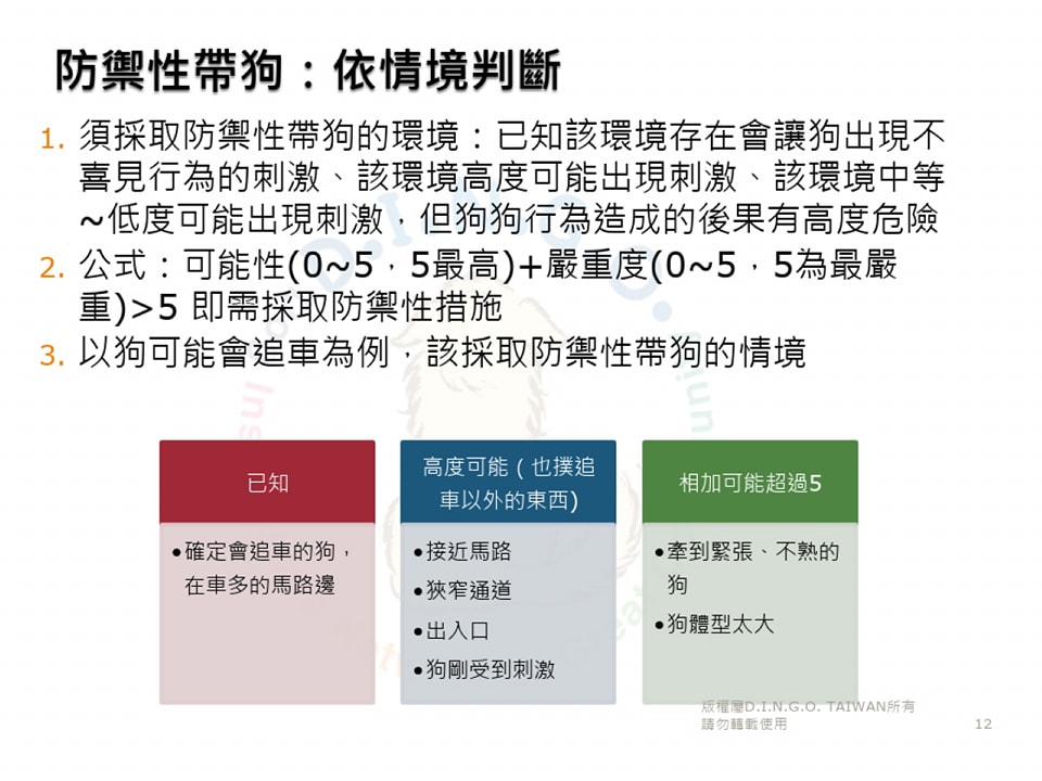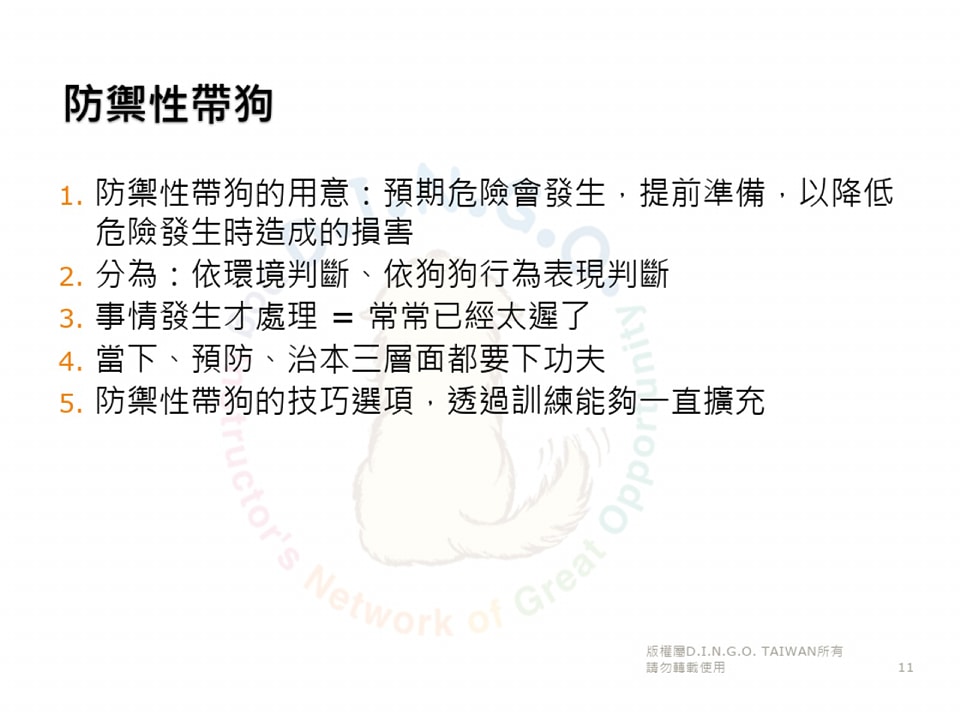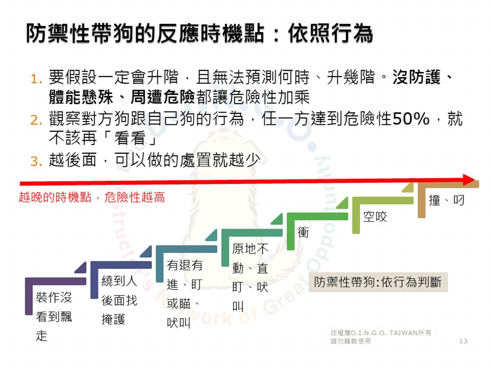 「防禦性帶狗」,是指:預先在可能發生衝突(危險)的情境,採取防禦措施,以避免或降低傷害。
