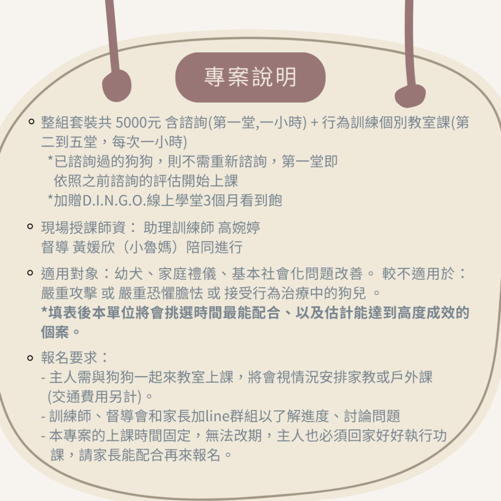 1. 整組套裝共 5000元 含 諮詢(第一堂,一小時) + 行為訓練個別教室課(第二到五堂,每次一小時)