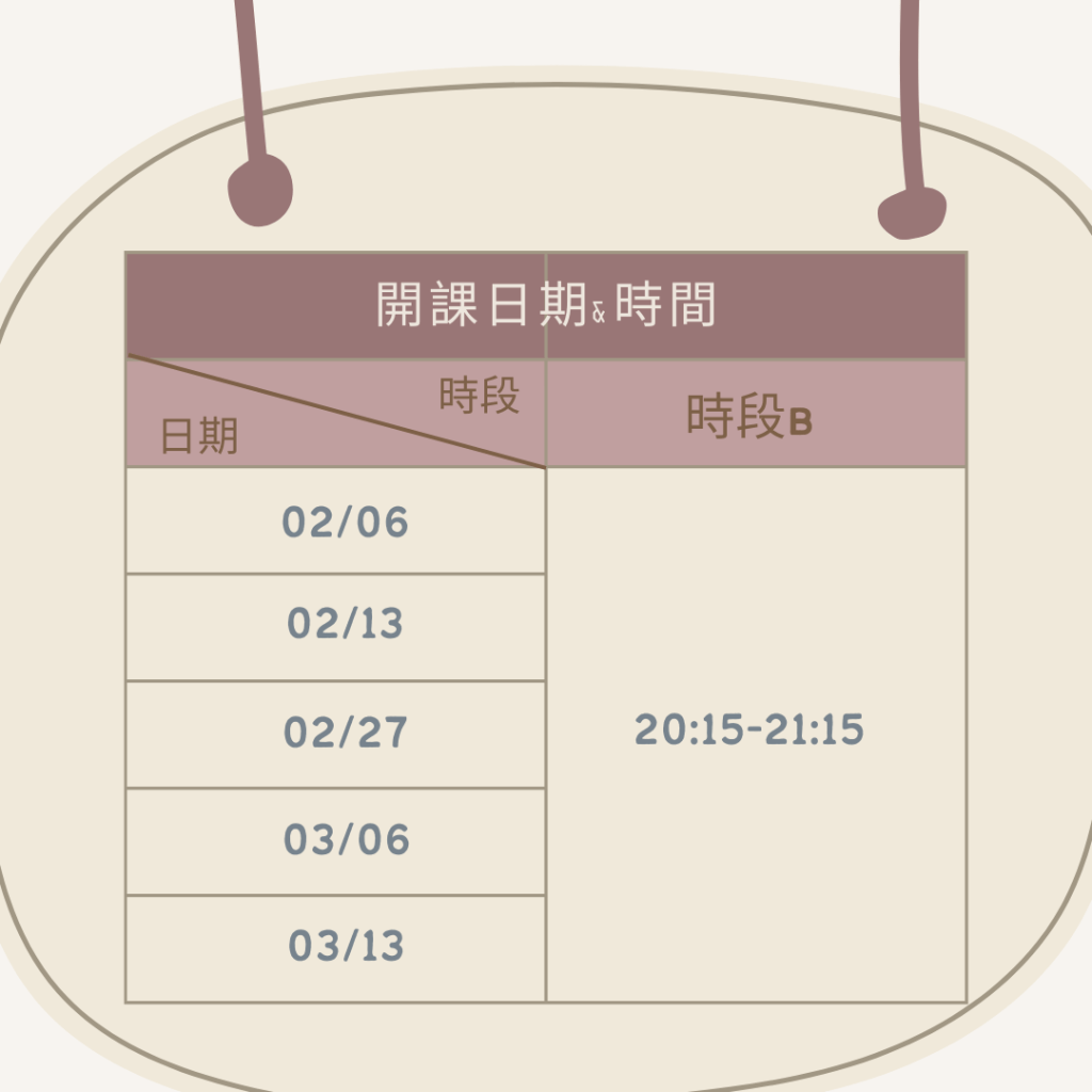 B時段 02/06(四)、02/13(四)、02/27 (四)、03/06 (四)、03/13(四) 20:15~21:15 高婉婷 老師