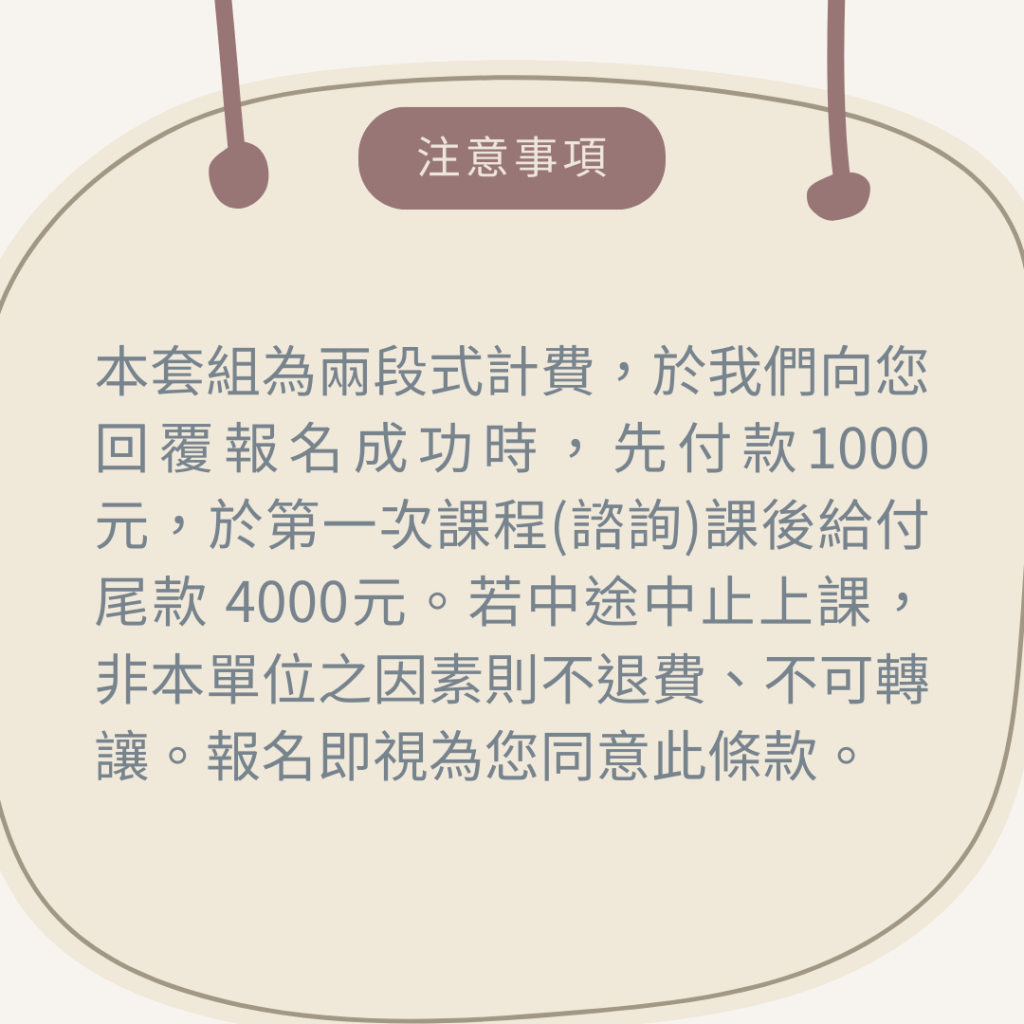 6. 本套組為兩段式計費,於我們向您回覆報名成功時,先付款1000元,於第一次課程
