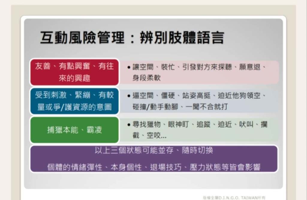 2025 年 3 月 20 日 dingo course 【好文分享】狗狗靠近的動機分析 by 小魯媽 辨識狗狗靠近過來的動機,可以從觀察行為來區別 靠近的是人或是狗都適用 不是搖尾巴就沒問題,情緒激動就會搖尾巴 不是狗狗興奮就沒問題,興奮要過來欺負、打獵或打架也會造成嚴重後果 狗狗看起來僵硬緊繃,要小心是警戒而不是穩定內斂 狗狗看起來沒反應,不代表就是好反應 以上大概參考 分享此文: 分享到 X(在新視窗中開啟) X 分享到 Facebook(在新視窗中開啟) Facebook 更多 分享到 WhatsApp(在新視窗中開啟) WhatsApp 分享到 LinkedIn(在新視窗中開啟) LinkedIn 喜歡 正在載入... 相關