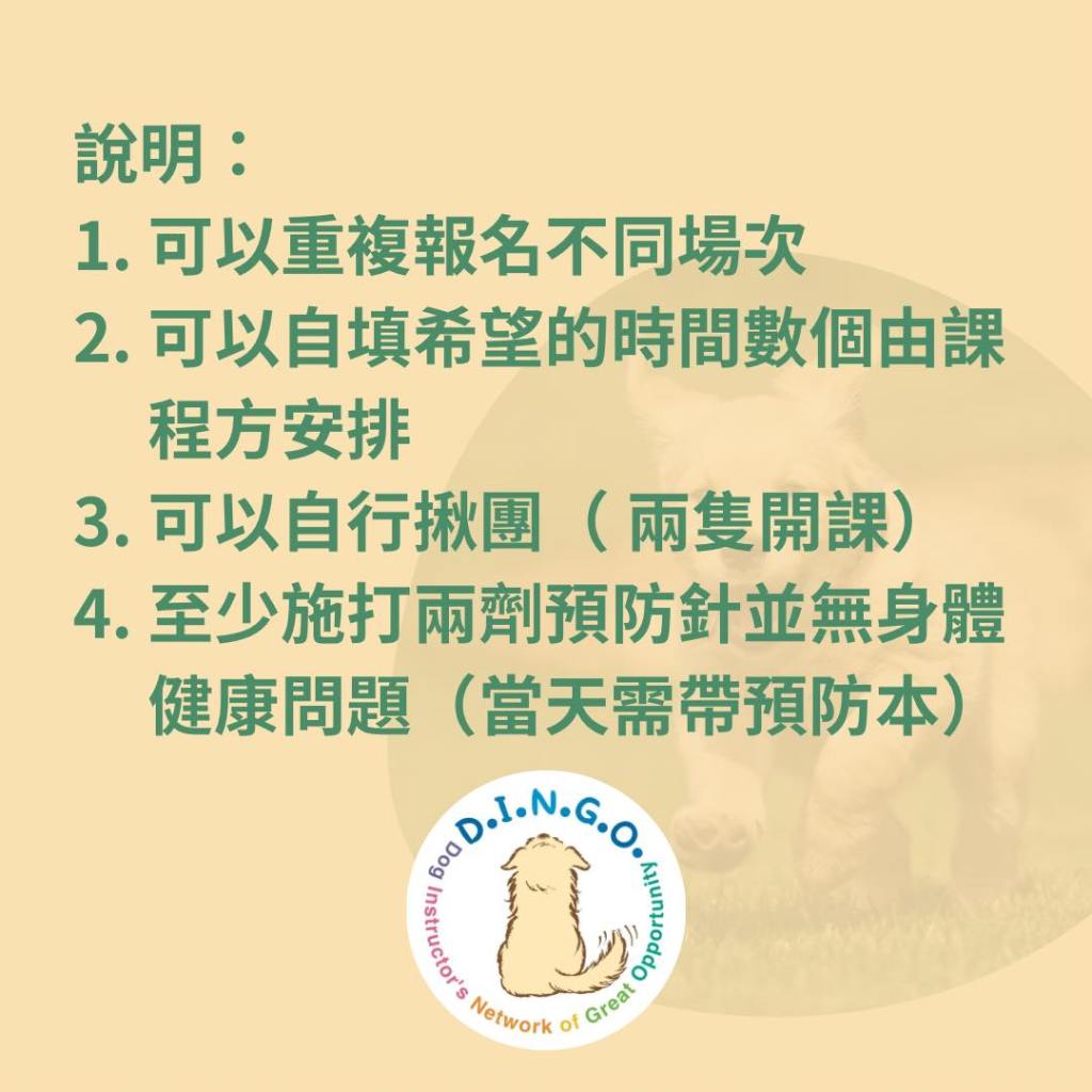 1.每隻狗兒最多可有2位共同照顧者一同旁聽。飼主(狗兒的主要照顧者)須成年,同行家人:12歲以下每位需一位成人陪同看照(不可與飼主重疊),若影響課程或動物情緒與安全,訓練師會請同行照顧者將家人帶出照顧。