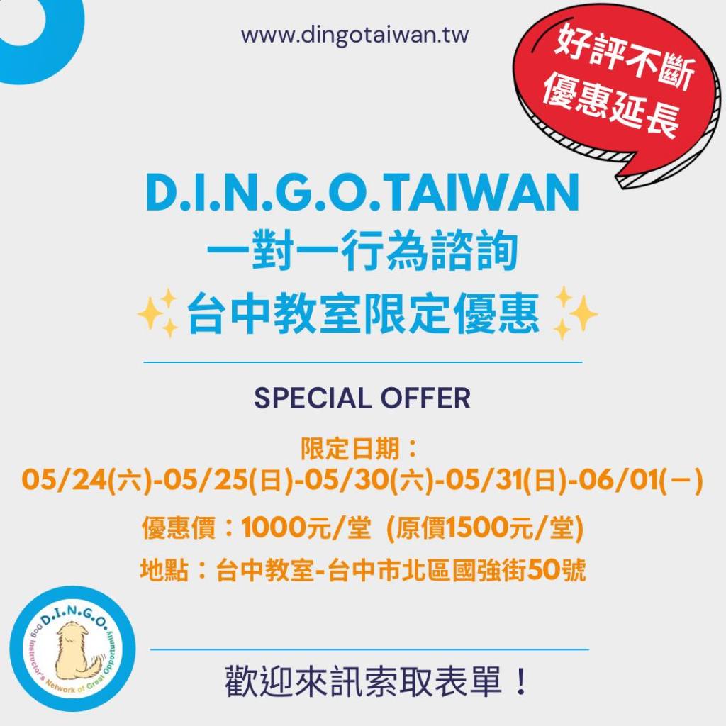 2025 年 5 月 20 日 dingo course 【最新消息】D.I.N.G.O.TAIWAN 一對一行為諮詢-台中教室限定優惠 D.I.N.G.O.TAIWAN 一對一行為諮詢 台中教室限定優惠 限定日期:05/24、05/25、05/30、05/31、06/01 優惠價:1000元/堂 (原價 1500元/堂) 地點:台中教室-台中市北區國強街50號 一對一課程相關資訊請詳閱圖片說明 歡迎來訊索取表單 #台中教室#狗狗課程#一對一#限定優惠#限定優惠價 分享此文: 按一下即可分享至 X(在新視窗中開啟) X 按一下以分享至 Facebook(在新視窗中開啟) Facebook 更多 分享到 WhatsApp(在新視窗中開啟) WhatsApp 分享到 LinkedIn(在新視窗中開啟) LinkedIn 喜歡 正在載入... 相關
