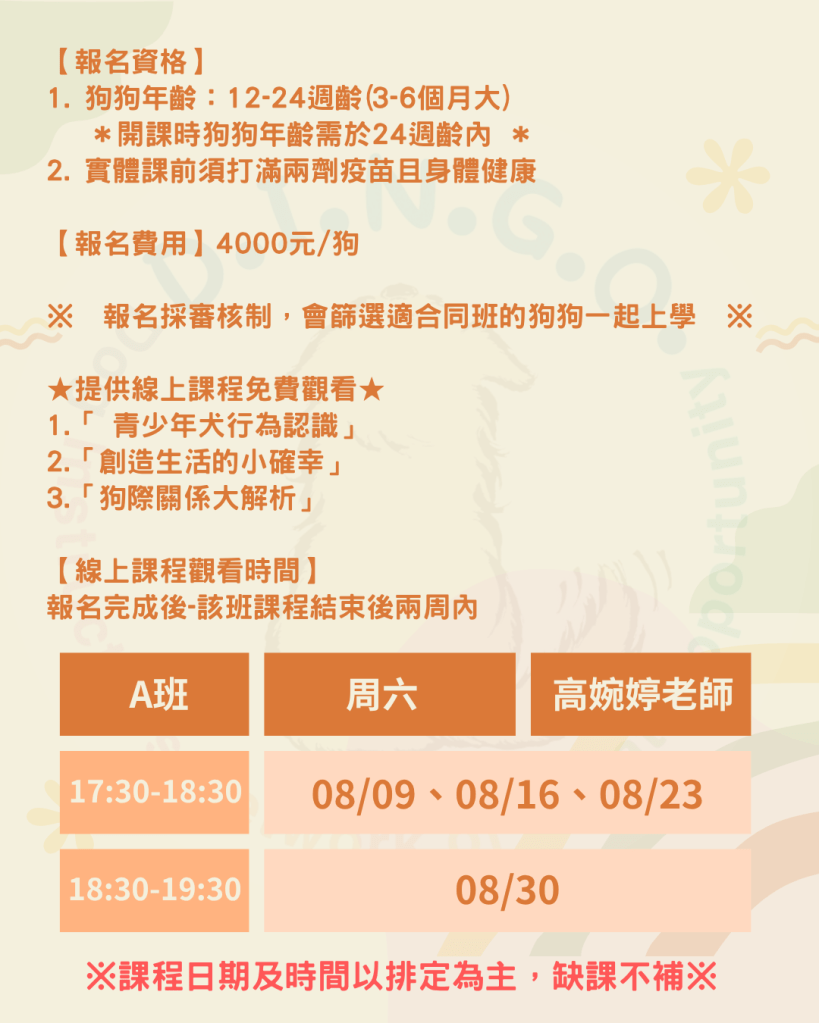 *開課時狗狗年齡需於24週齡內 *