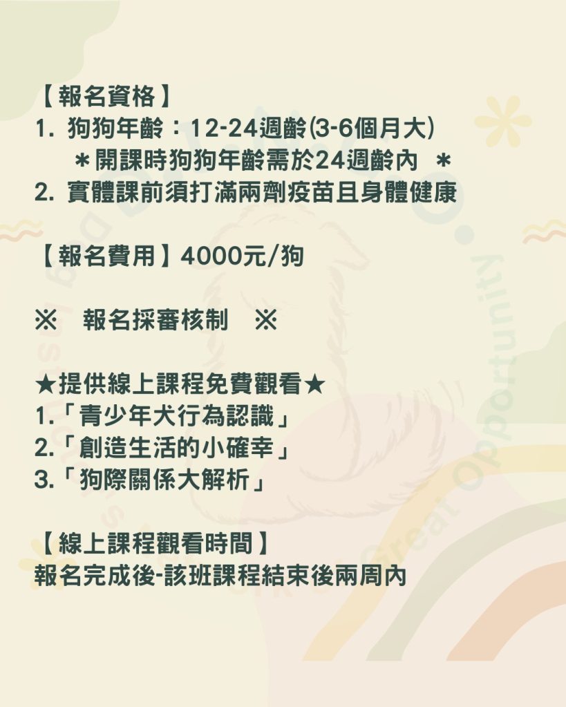 從幼幼階段開始,一步步協助家長與狗狗互相理解、學習一起生活的種種眉角,不會錯過最重要的社會化時期。而在邁向青少年,狗狗最容易走歪的時候,繼續提供指導,讓人狗度過風暴,邁向未來幸福的康莊大道。