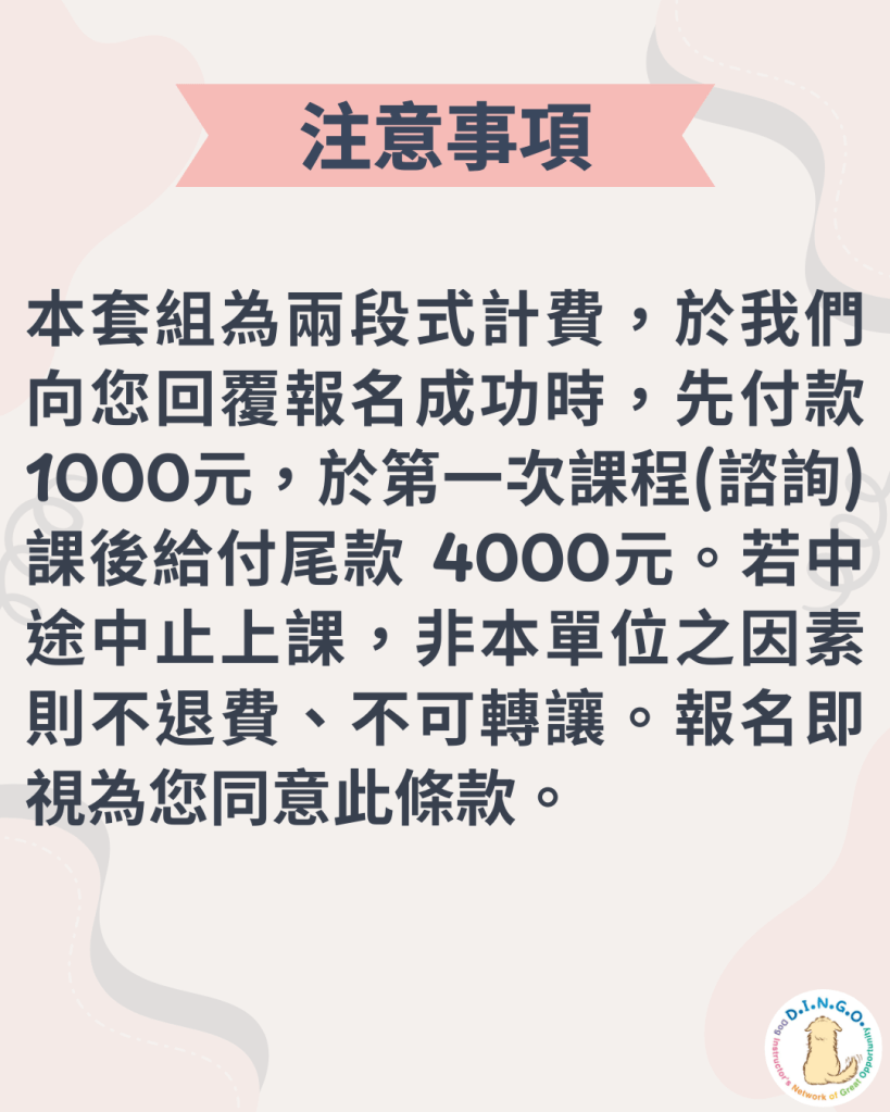 6. 本套組為兩段式計費,於我們向您回覆報名成功時,先付款1000元,於第一次課程