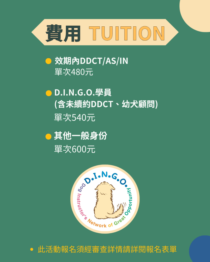 ─ D.I.N.G.O.學員(含未續約DDCT、幼犬顧問) :單堂報名540元/堂