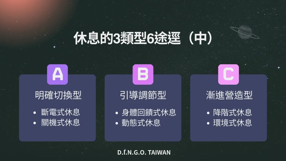 請記得,很多時候的休息,是為了調節與恢復、是為了避免過度耗損、是為了重整狀態,不需要一昧追求「不動、緩慢」喔!