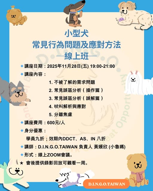 本講座將由小型犬的角度出發,從各種問題行為切入,重新認識問題原因、進一步了解狗狗的需求、壓力與表達方式,提供主人們更好的應對方法。
