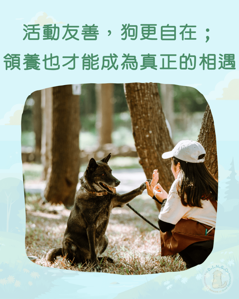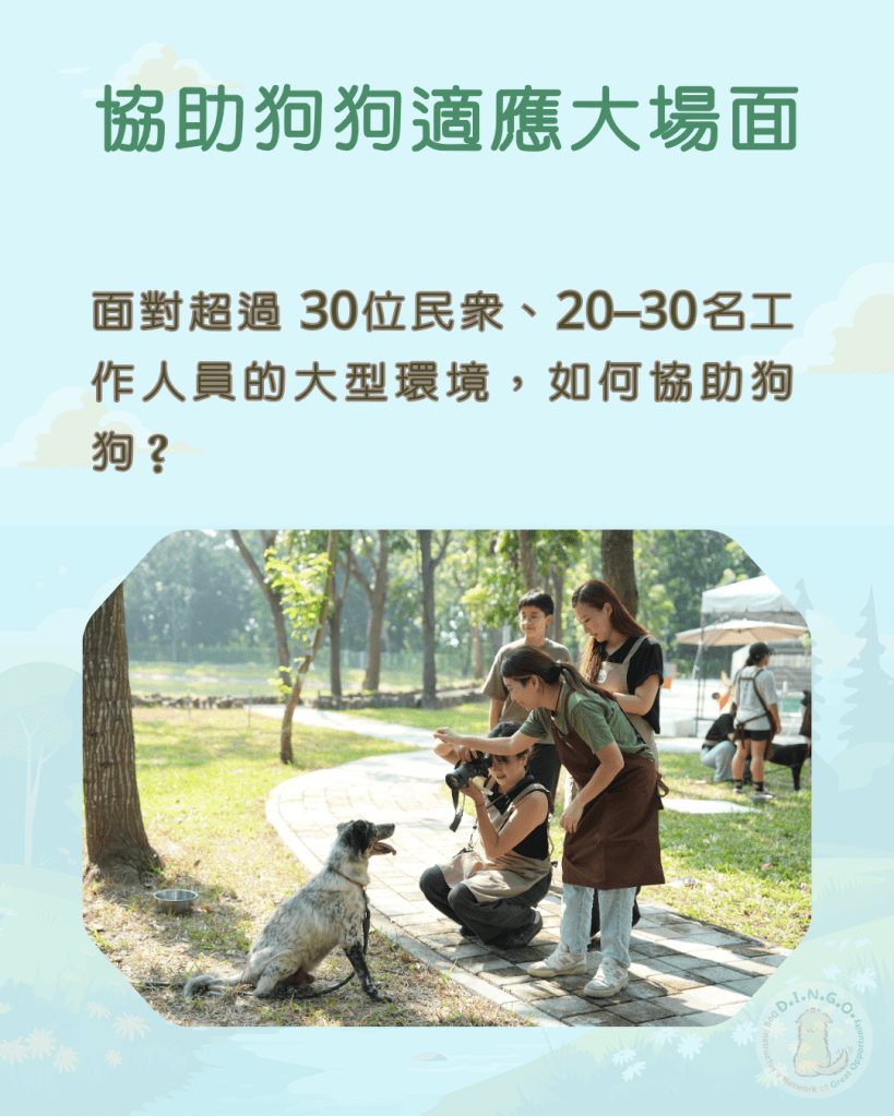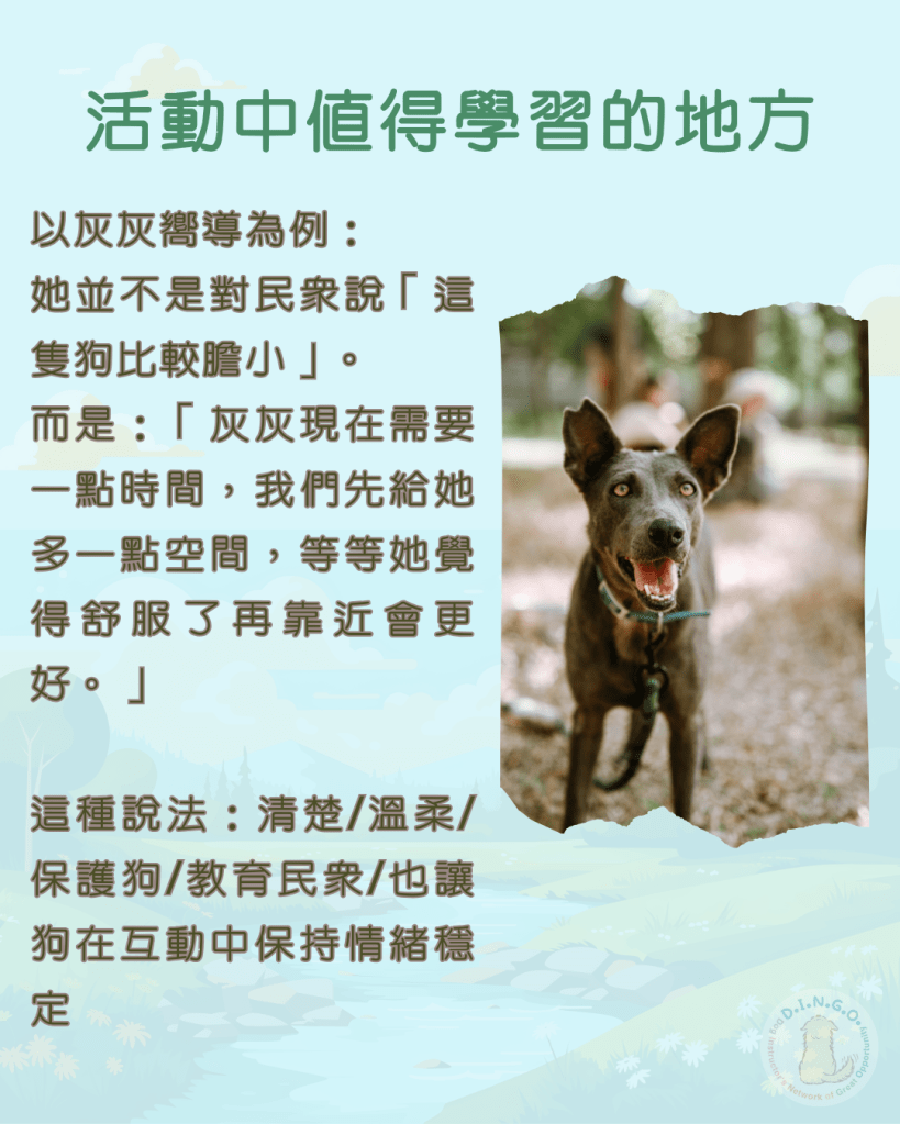 這次負責帶灰灰的狗狗響導是DINGO的學員,她家裡的狗和灰灰一樣都屬於慢熟型,因此她非常能理解灰灰的需求。活動中,我特別佩服她的一點是:她不僅能準確讀懂灰灰當下的情緒,也能用非常溫柔、清晰的方式向民眾說明灰灰的狀態。適時替灰灰拒絕過度靠近的互動,例如告訴民眾:「灰灰現在可能還需要一點時間適應,我們先給她多一點空間,等等她覺得舒服了再靠近會更好。」這讓第一次接觸慢熟狗狗的民眾,也能在現場學習到「如何尊重狗狗」。