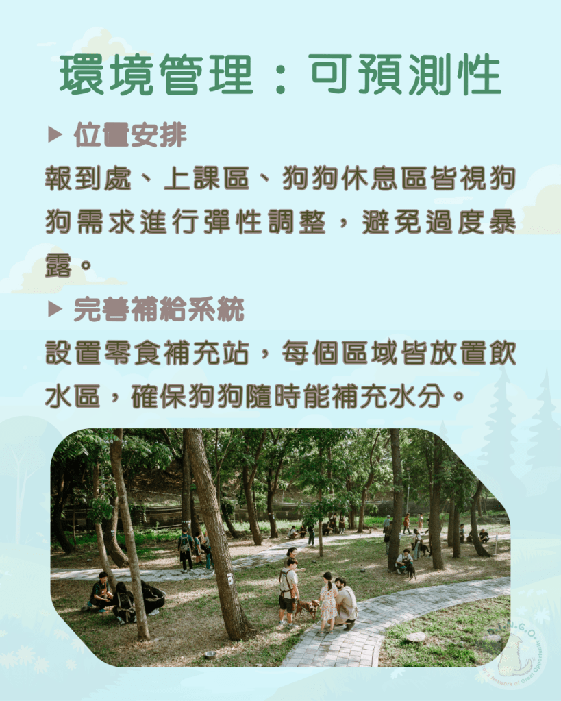 (3)建立狗狗基本資料:陪狗狗的嚮導們除了需瞭解自己要照顧的狗狗以外,也需要知道其他狗狗的雷點,理解對方的需求在活動時就可以更安全,有默契地合作。