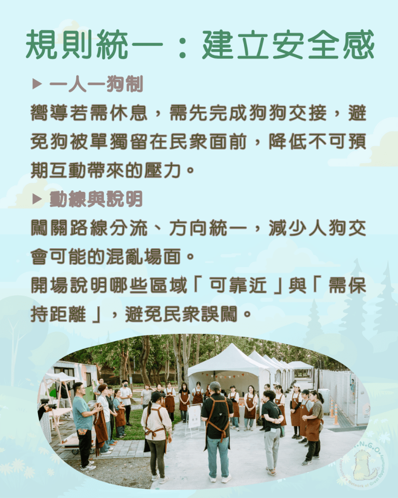★一人一狗制:嚮導若需要休息,需先將狗狗交接給其他工作人員,避免狗狗被單獨留下面對民眾。