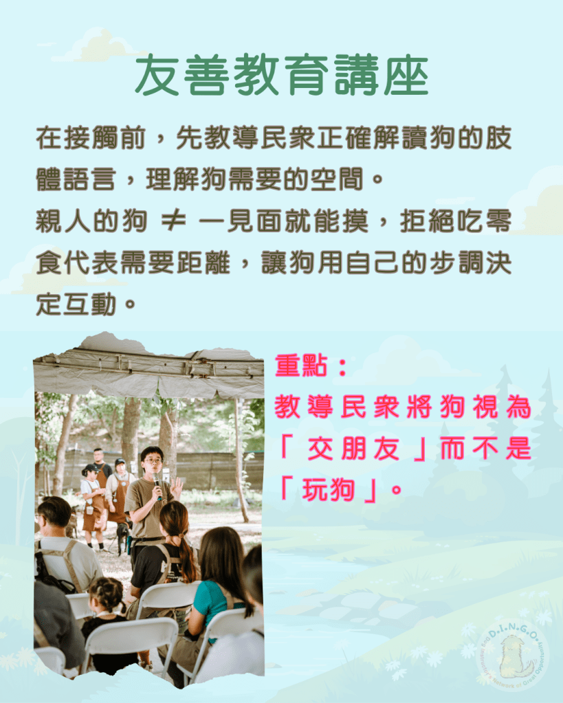 (4)友善教育講座:講座會先教導民眾如何觀察狗狗的肢體語言,第一次接觸時怎麼做狗才會覺得這個陌生人是想交朋友,而不是只是想來玩狗,也提醒活動中12隻狗狗雖然都親人,但每隻狗狗喜歡的互動方式都不太一樣,親人不代表一見面就可以摸,當狗拒絕吃零食時,請給予狗狗空間時間,人類彼此先聊聊天或由嚮導帶著狗去走一走,狗狗自在一些後,會比較願意進行互動。