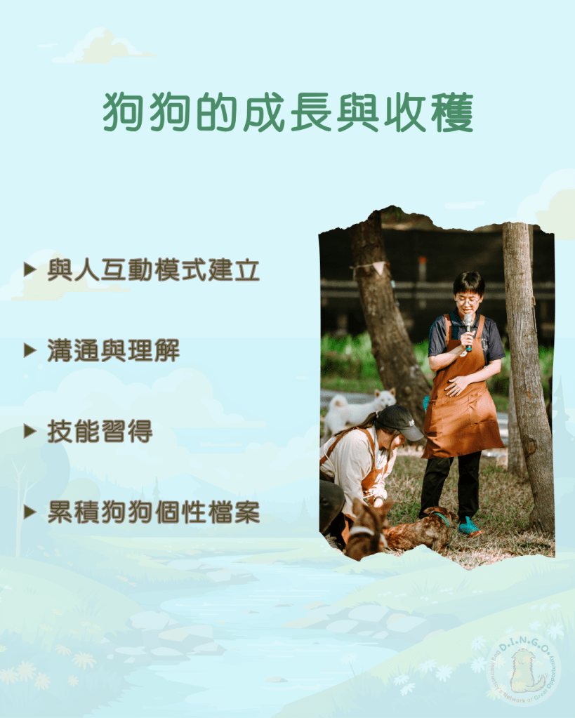(4)狗狗們在活動中跟許多不同人互動,讓狗學習跟人社會化,過程中不論是發現狗狗有哪些優缺點,對往後認養都很有幫助