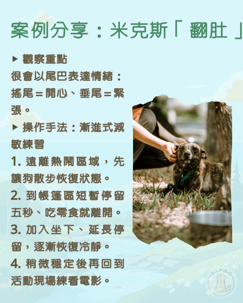 他的尾巴非常好觀察情緒,開心時會搖尾巴,稍微緊張時會垂尾,活動尚未正式開始前,我選擇直接帶他離開休息區,去旁邊走走晃晃,然後在待會闖關活動中會用到的帳篷區稍作停留,讓他有機會冷靜下來,一開始停留時間不用太久,從願意停留5秒鐘吃點零食就離開,下一次增加坐下指令,逐漸拉長停留在帳篷的時間,過程中情緒就會慢慢恢復冷靜,重新回到活動現場就可以比較能容忍環境的變動,就能以比較輕鬆的情緒在活動現場進行看電影的練習。