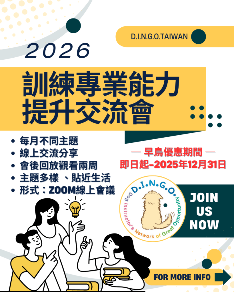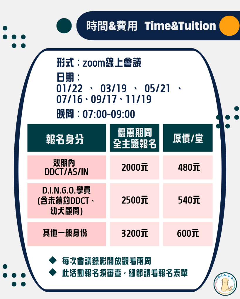 ─ D.I.N.G.O.學員(含未續約DDCT、幼犬顧問) :早鳥優惠價 2500元 (單堂報名540元/堂)