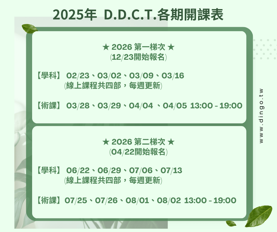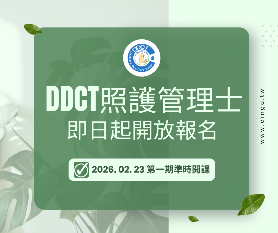 DDCT(D.I.N.G.O. Dog Care Taker)是由我們系統認證的能力證照。課程內容是以D.I.N.G.O.行為訓練的知識為架構,培養學員對狗狗行為的理解、對問題的分析,瞭解基礎訓練的技巧,以安全管理為工作最基本的要求,瞭解主人與狗狗的需求,未來可以不只是主人跟狗狗生活的得力助手,更是重要的生活顧問。