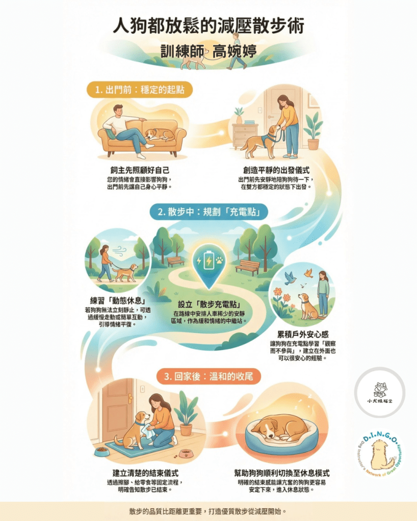 當散步從出門前就先照顧好人的狀態,讓人與狗站在較穩定的起點;散步過程中安排充電點,允許用動態休息調節情緒;回家後再透過清楚的結束訊號協助降速,狗就能在日常中持續消化壓力。散步真正穩定情緒的關鍵,不是走得多遠,而是整個流程是否有被好好收頭與收尾。